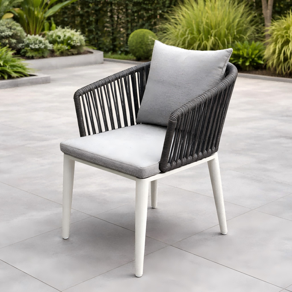 ডাইনিং চেয়ারগুলিতে একটি দড়ি বোনা ব্যাকরেস্ট বৈশিষ্ট্যযুক্ত, যা আরামদায়ক সহায়তা প্রদান করার সময় একটি আধুনিক এবং মার্জিত চেহারা তৈরি করে। ফ্রেমটি পাউডার-কোটেড অ্যালুমিনিয়াম দিয়ে তৈরি, যা মরিচা এবং বাইরের আবহাওয়ার জন্য চমৎকার প্রতিরোধের প্রস্তাব দেয়।