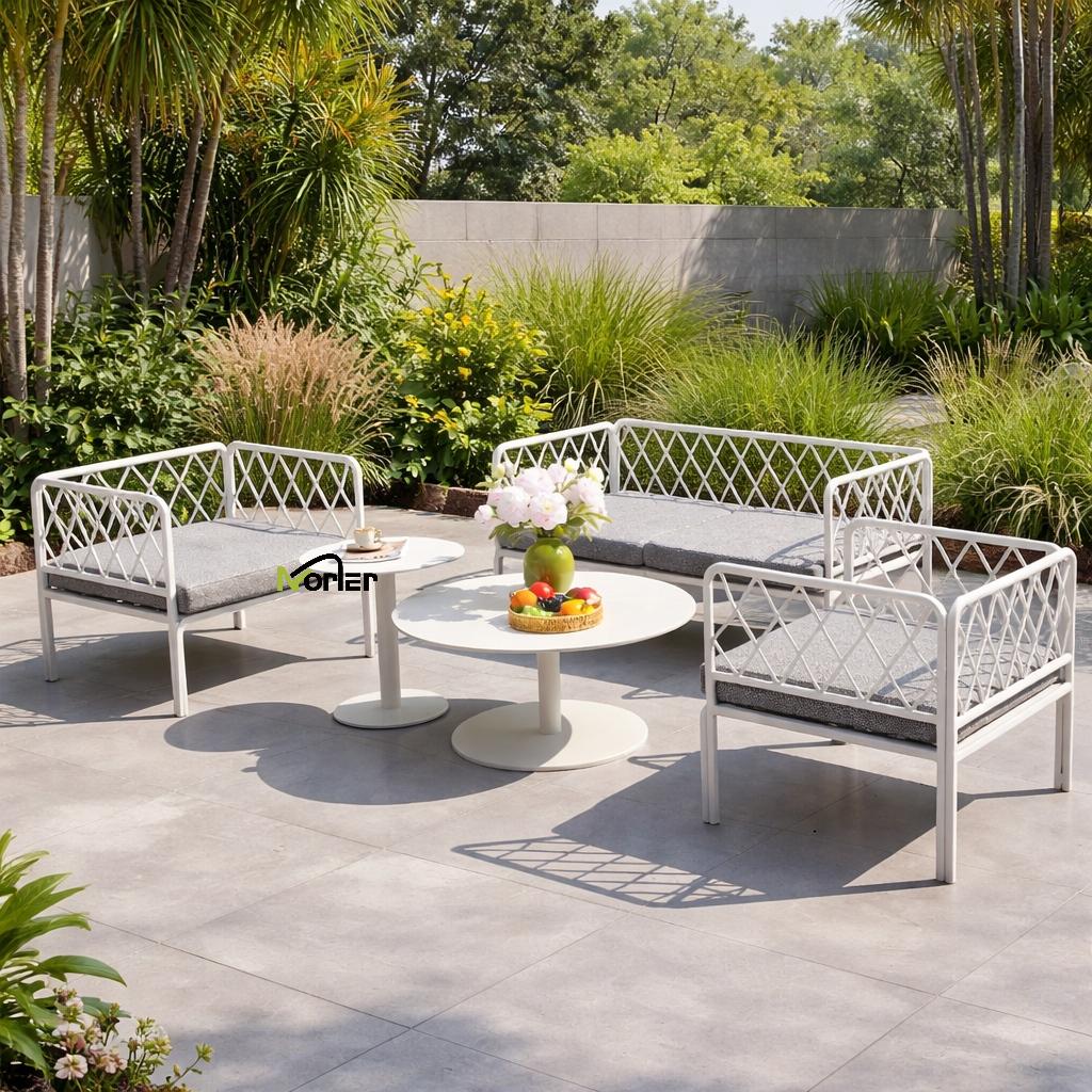 এই আধুনিক বহিরঙ্গন সোফা সেটটিতে একটি সুন্দর কারুকাজ করা জ্যামিতিক ধাতব ফ্রেমের সাথে একটি পরিষ্কার এবং ন্যূনতম নকশা রয়েছে। শক্তিশালী কাঠামোগত সমর্থন বজায় রেখে খোলা জালি কাঠামো একটি হালকা এবং মার্জিত চেহারা তৈরি করে।